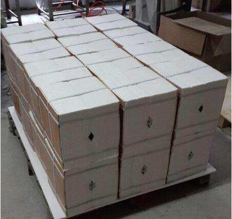 根據(jù)模塊的尺寸,計(jì)算出纖維毯的長(zhǎng)度后裁切備用。經(jīng)人工折疊后,用5t的壓力機(jī)壓縮打包而成。