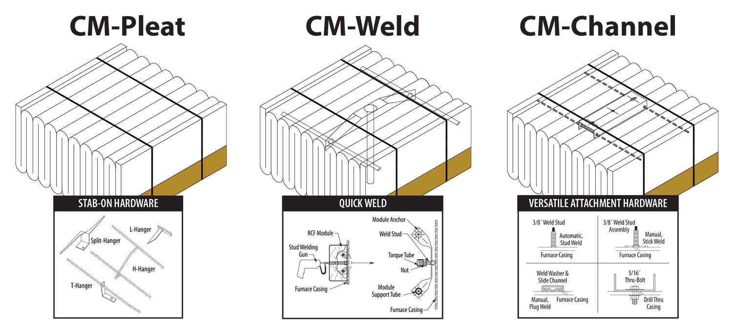 陶瓷纖維模塊可以通過幾種不同的連接方式輕松地固定在各種熱處理設(shè)備的內(nèi)部鋼殼上。用來連接的錨固件預(yù)埋在模塊內(nèi)部,不必接受火焰的沖刷和爐膛氣氛的腐蝕,有效延長陶瓷纖維模塊的使用壽命。